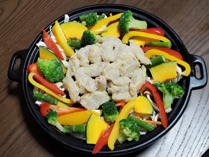 解凍後、お好みの野菜と一緒にフライパンやホットプレートなどで約10分焼くだけの簡単調理。