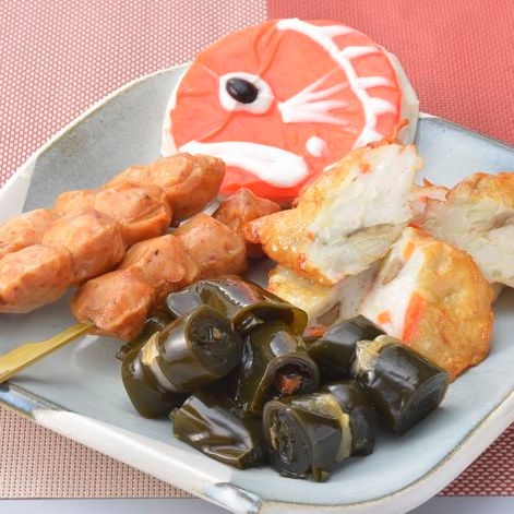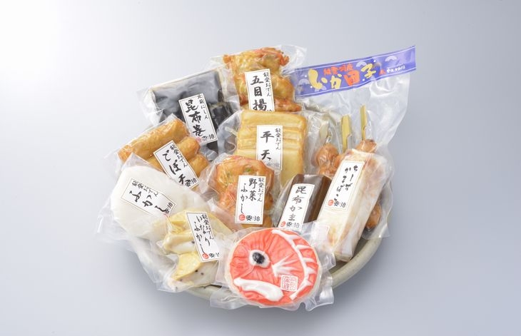 能登いかたっぷりのいかだんご、昆布かまぼこ、チーズかまぼこ、自家製昆布巻煮。また御祝事に使用される鯛かまぼこをセットにしました。