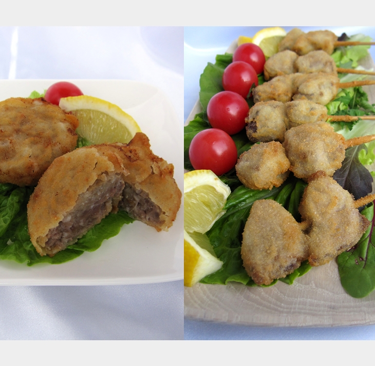 串揚げ専門店ならではの、きめ細かいパン粉を使用しておりますので軽い食感です。柔らかく仕上げたひと口サイズの串カツはさっぱりとしたイノシシ肉の味をそのままお楽しみいただけます。また、メンチカツは玉ねぎを加えてまろやかに仕上げております。食べ比べもお楽しみいただけます。