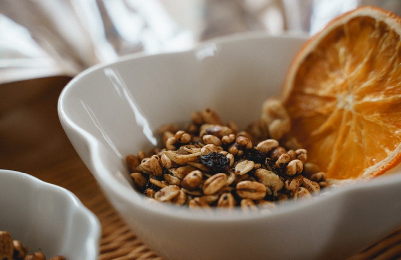 オルジュシリアルにフルーツやナッツをミックスした、そのままでももちろ ん、ヨーグルトやフルーツにかけてもおいしくお召し上がりいただけるグラノーラです。