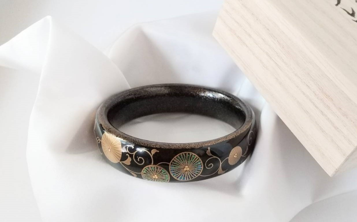 ブレスレット全体に松唐草模様を貝を使った螺鈿技法と金粉を使った蒔絵で仕上げました。