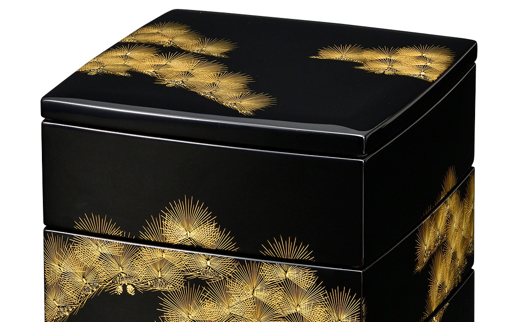 たて約18.4cm×よこ約18.4cm×高さ約19.4cmの松沈金が施された、輪島塗の三段重です。