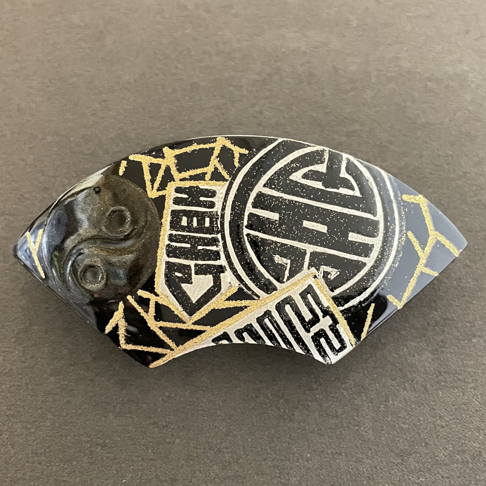 扇型の黒本べっ甲に寿の文字を文様化しました。