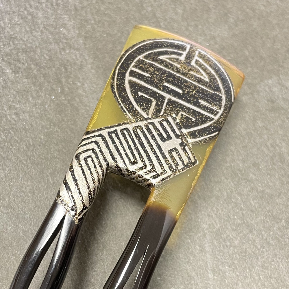 四角型の本べっ甲かんざしに寿の文字を文様化しました。