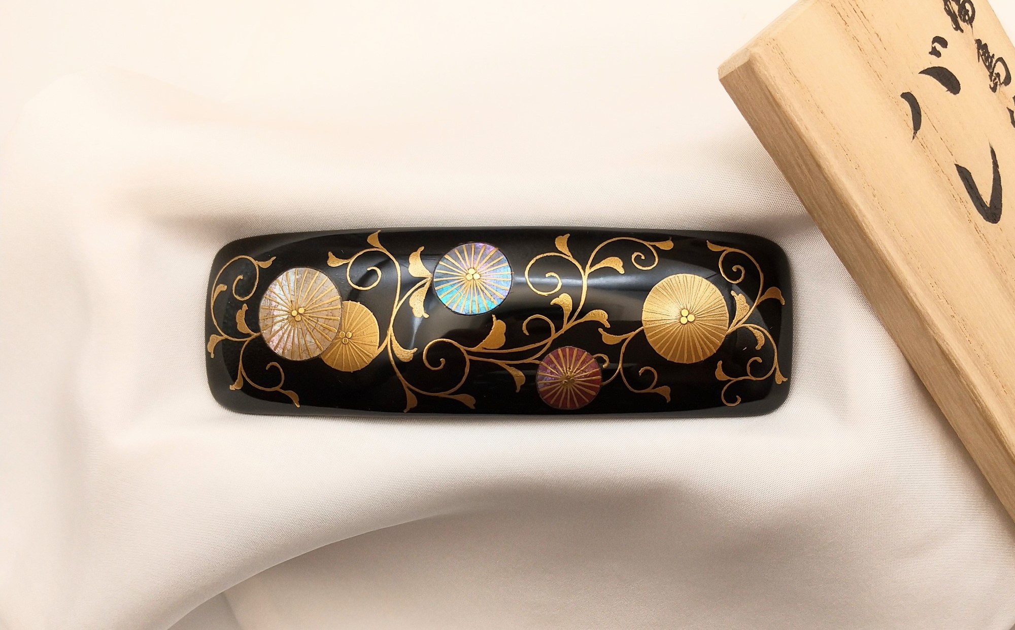 バレッタ全体に唐松唐草模様を描き、貝を使った螺鈿技法と金粉を使った蒔絵で仕上げました。