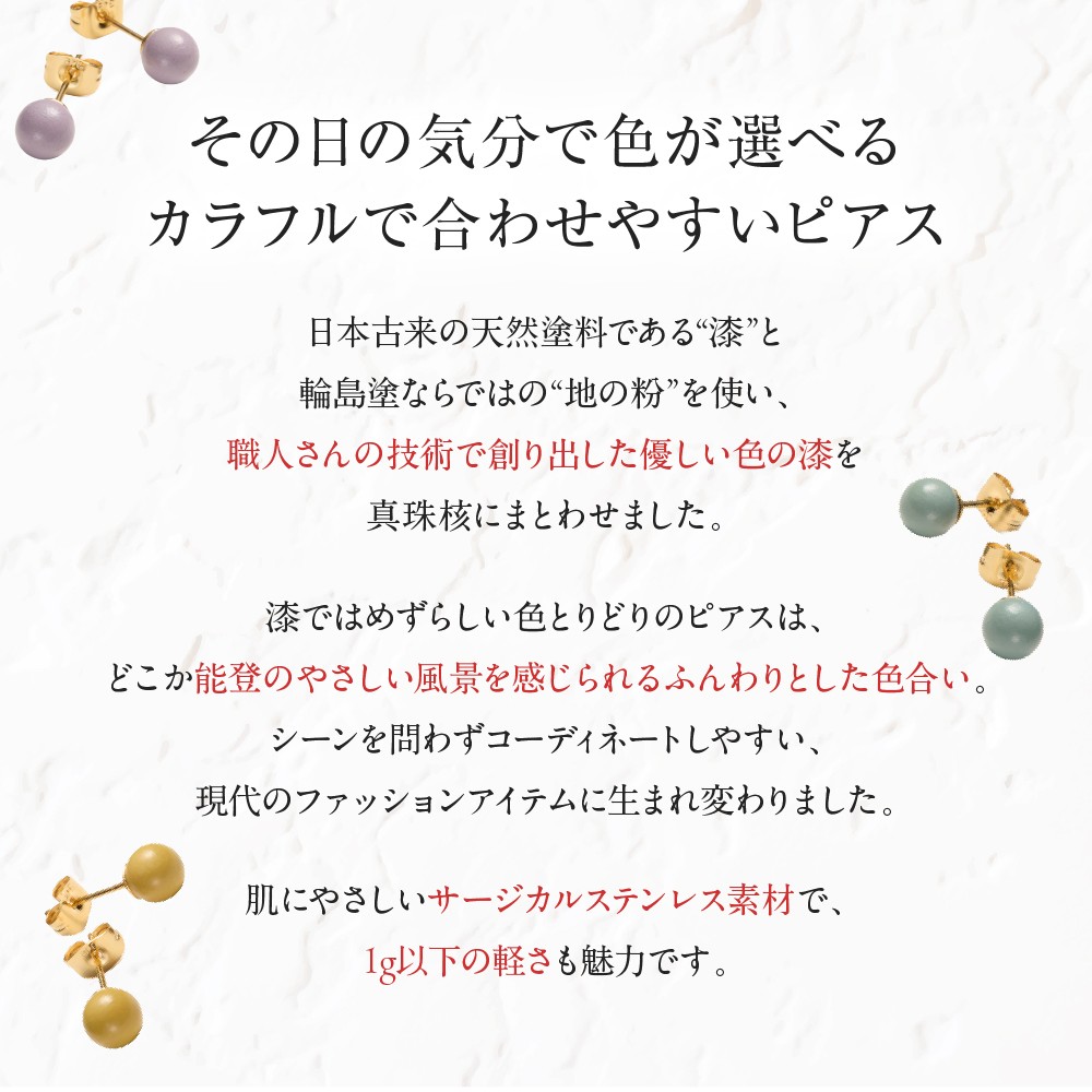 どこか能登のやさしい風景を感じられる、見たことがない「ふんわり」としたイロトリドリのうるしのピアスはシーンを問わずコーディネートしやすく、あなたのその日の気分で色を選べる8色展開です!