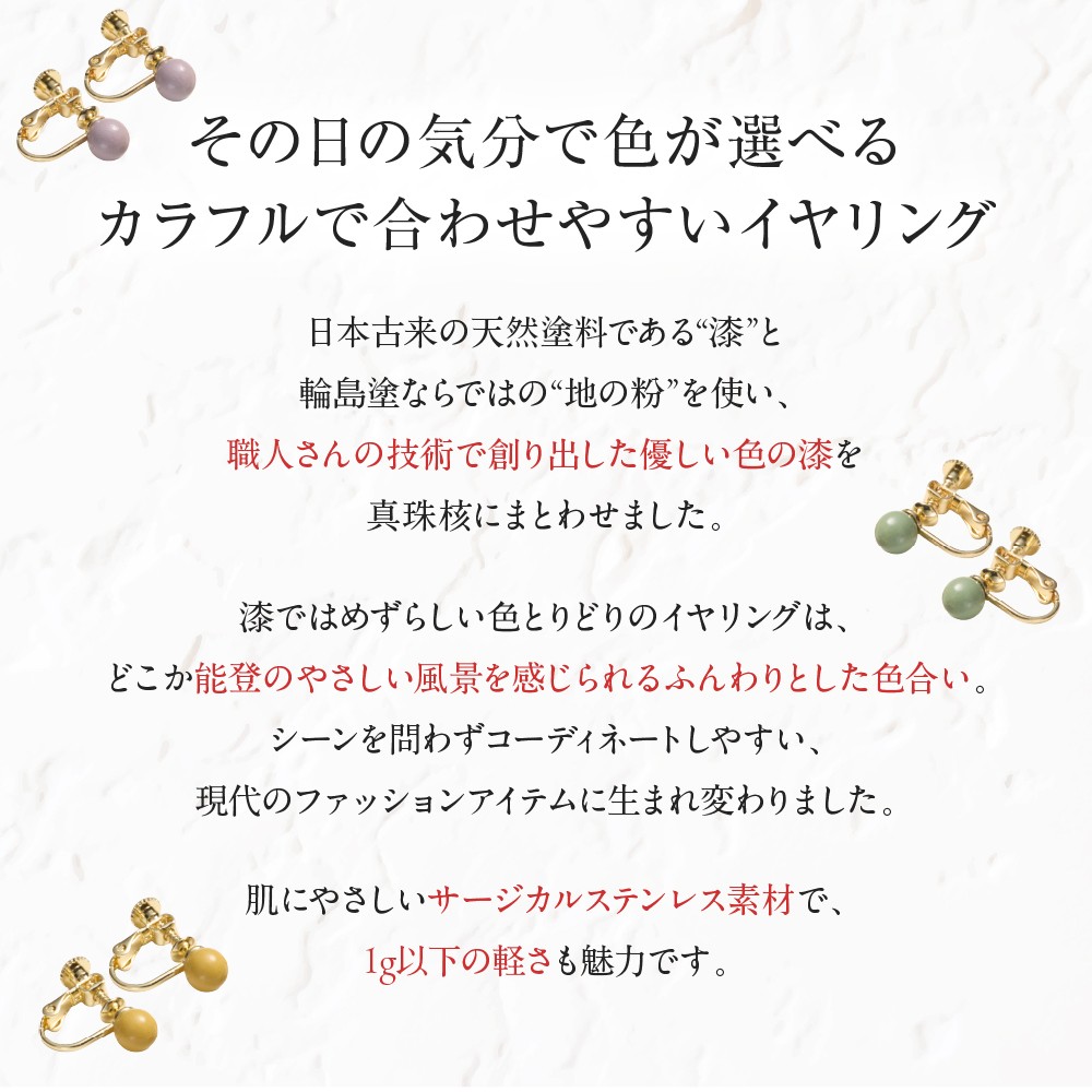 どこか能登のやさしい風景を感じられる、見たことがない「ふんわり」としたイロトリドリのうるしのイヤリングはシーンを問わずコーディネートしやすく、あなたのその日の気分で色を選べる8色展開です!