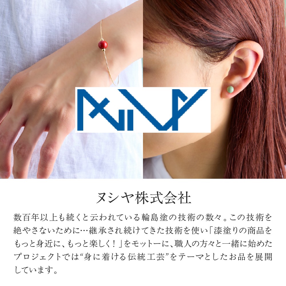 日本古来の天然塗料"漆"と輪島塗ならではの"地の粉"を使い、職人さんの技術で創り出した優しい色の漆を真珠核にまとわせて、現代のファッションアイテムとして生まれ変わりました。