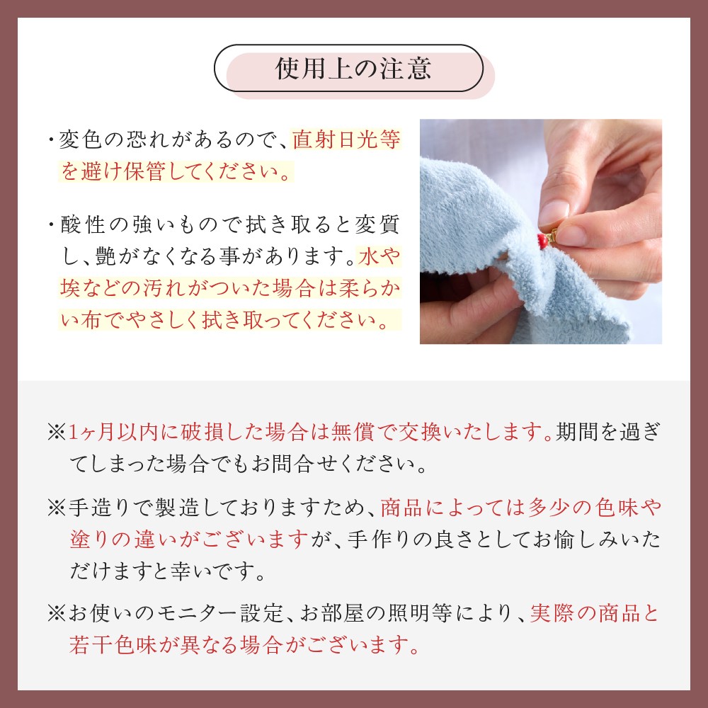 ※手作りで製造しておりますため、商品によっては多少の色みや塗りの違いがございますが、手作りの良さとして、お愉しみいただけますと幸いです。