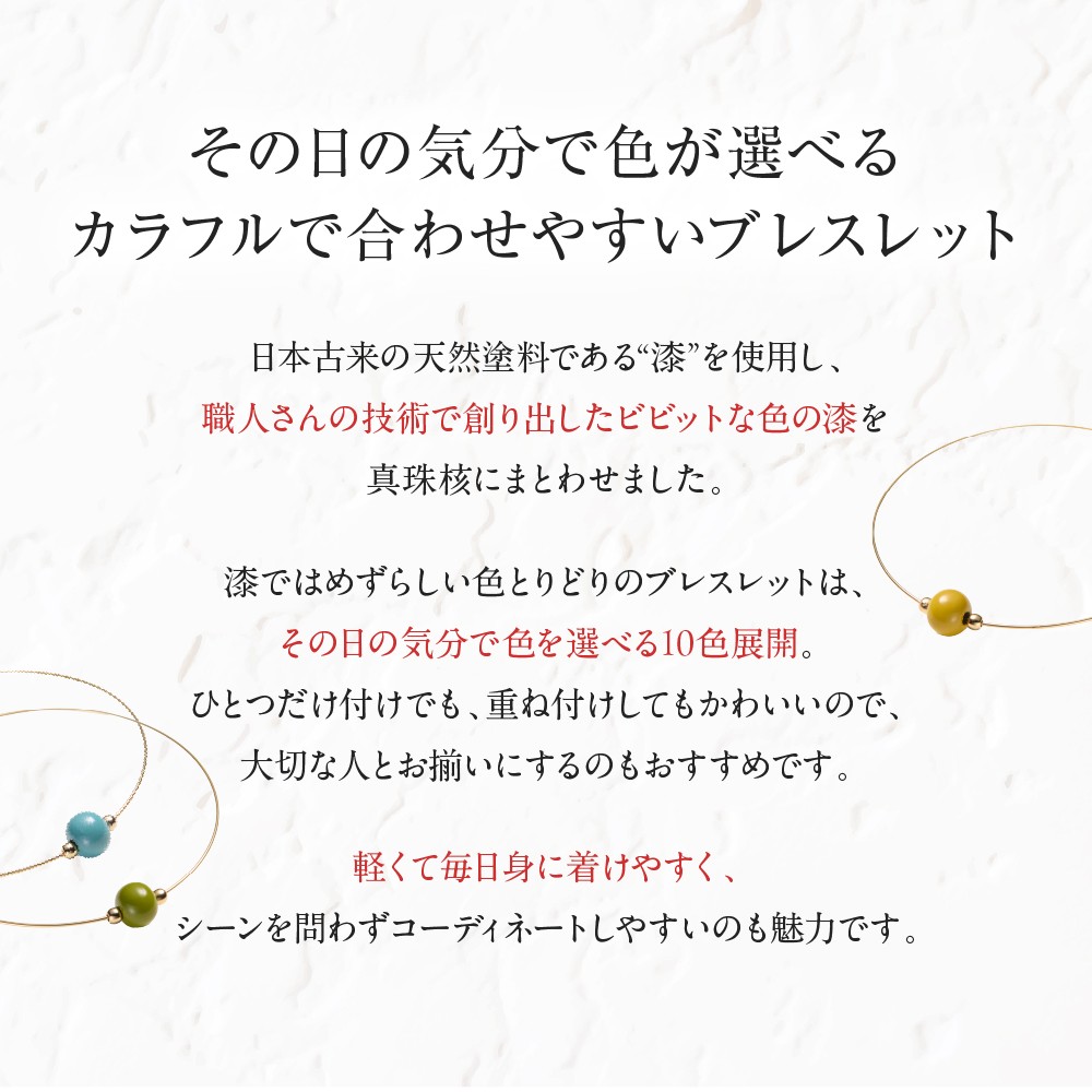 どこか能登のやさしい風景を感じられる、見たことがない「ふんわり」としたイロトリドリのうるしのブレスレットはシーンを問わずコーディネートしやすく、あなたのその日の気分で色を選べる10色展開です!