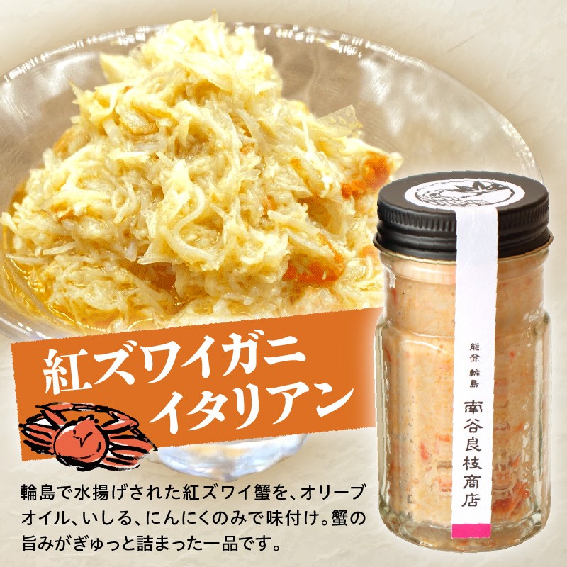 紅ズワイ蟹イタリアン:輪島産の紅ズワイ蟹を一匹ずつ手作業で身をほぐし、オリーブオイル・にんにく・いしる・唐辛子のみでシンプルに味付けではありますが、紅ずわい蟹の旨みがぎゅっとつまっています。そのままはもちろん、ご飯・パン・バゲットにのせても、パスタに和えても美味しく、アレンジ自在の贅沢な一品です。