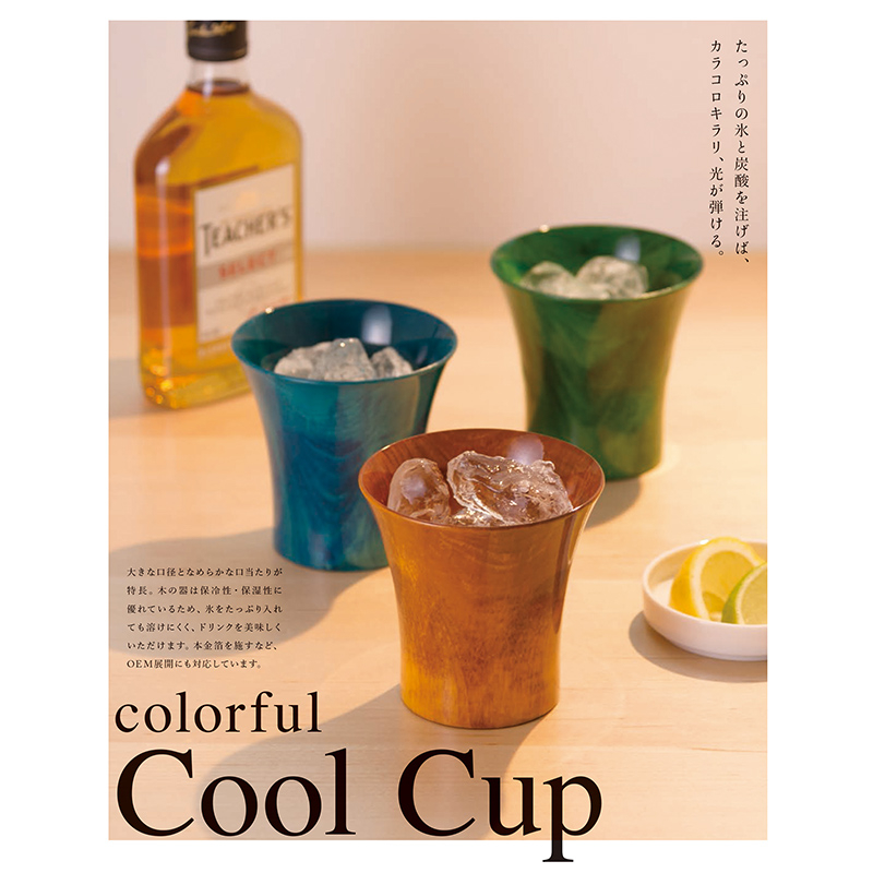 シルエットが美しいクールカップは、大きな口径となめらかな口当たりが 特長。木の器は保冷性・保湿性に優れているため、氷をたっぷり入れても 溶けにくく、お酒はもちろんお茶やジュースも美味しくいただけます。