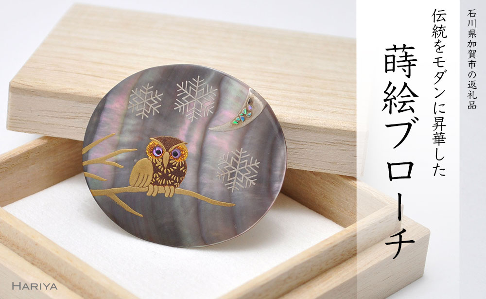 チョイスPayポイントと交換できる品 雪ふくろう蒔絵 黒蝶貝ブローチ 蒔絵 漆 黒蝶貝 ふくろう 雪 うるしアート ハンドメイド ブローチ アクセサリー ギフト 伝統工芸 工芸品 国産 日本製 復興 震災 コロナ 能登半島地震復興支援 北陸新幹線 F6P-0308
