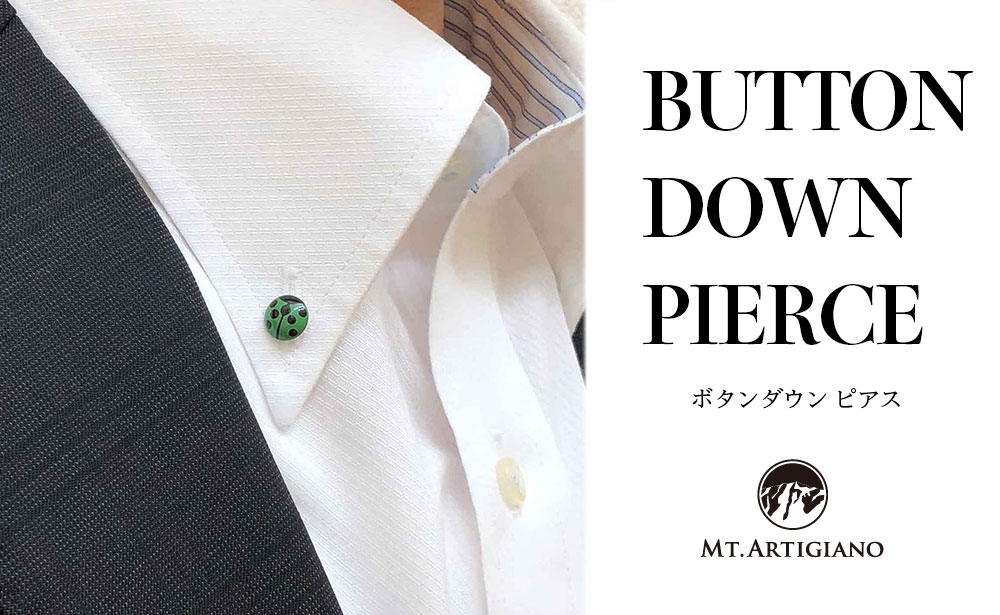 ボタンダウンシャツの着こなしをさらに楽しむために襟元に遊びと技の効いた「ボタンダウンピアス 」が生まれました。