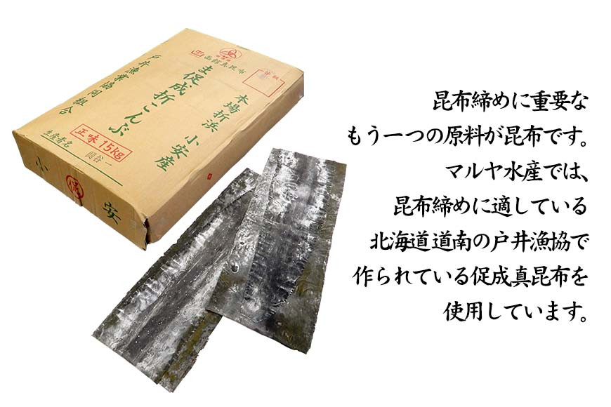 | 容量 | 昆布締めの種類は、時期によって変わります。 マルヤ水産が自信を持ってオススメする昆布締めから1パック2人前程の昆布締めを5種類詰め合わせてお届けします。 |