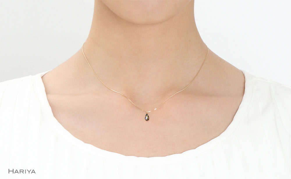 ペンダントチェーンの素材はK10YG。長さを調節するアジャスターを備え、体の曲線に滑らかに沿います。ピアス・指輪の金具の素材はK18。チェーン同様しなやかな女性らしさを際立たせてくれます。