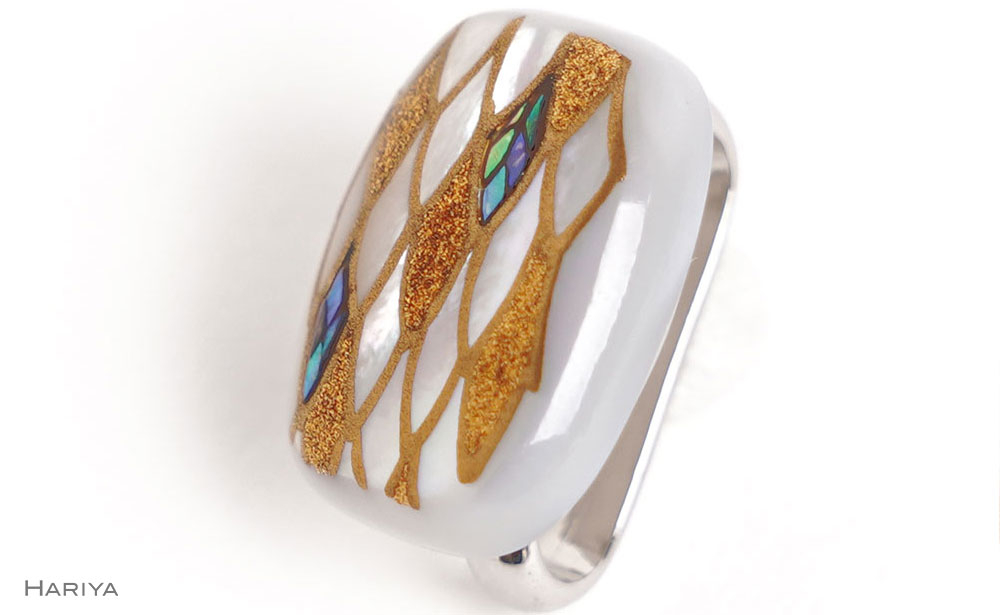 アクセントに使った螺鈿の菱形の集まりは鱗の様に見えます。