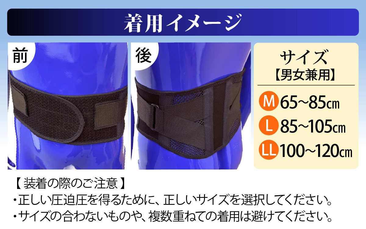 | 容量 | 腰サポーター 1枚 【サイズ(男女兼用)】 ・Mサイズ:65cm~85cm ・Lサイズ:85cm~105cm ・LLサイズ:100cm~120cm ※サイズをお選びください。 |