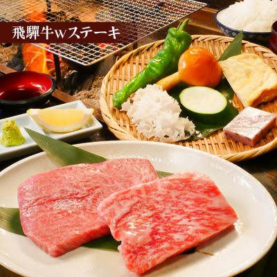 飛騨牛サーロインステーキもしくはヒレステーキ(80g)/飛騨牛ランプステーキ(120g)/焼き野菜/ご飯/味噌汁/漬物/デザート など