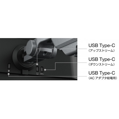 入力端子には、PCへの給電・外部機器からの受電駆動に対応したUSB Type-Cを搭載。USB Type-Cケーブル1本で、映像・音声・USB信号の伝送とノートPCへ給電(最大60Wまで)を同時に実現できるほか、FLTのACアダプタを接続せず、デイジーチェーン接続時の中継モニターやノートPCなど、外部機器からのUSB-C給電のみで動作可能です。
