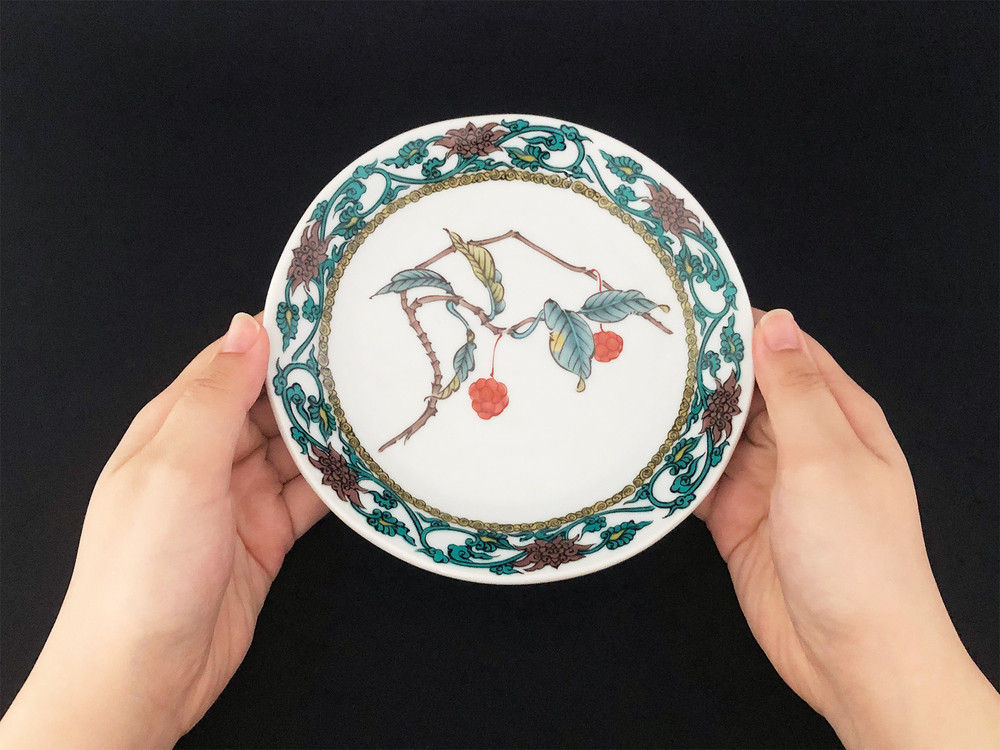 縁に鮮やかな唐草をあしらい、中央には野山に自生する木の実などの果実がシックな色味で絵付けされています。取り皿として重宝する皿揃です。