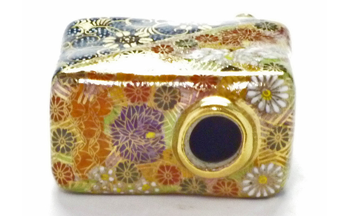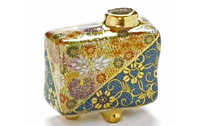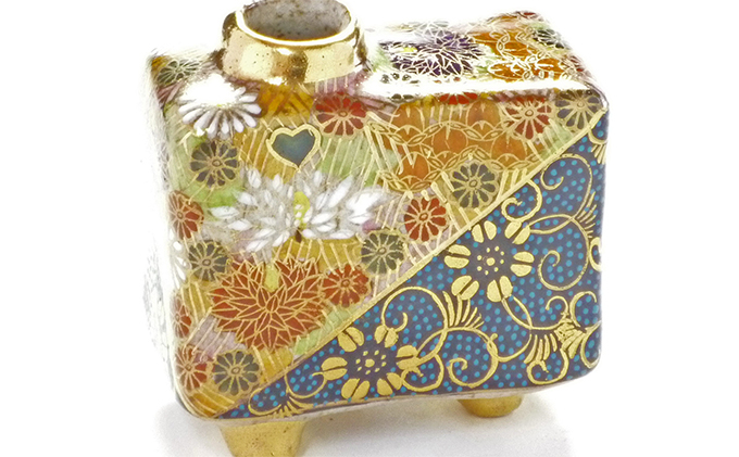 九谷焼の手の平サイズの花瓶です。青粒と金花詰融合の絵付けの最高版です。