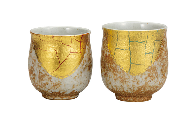 薄く伸ばした金箔を絵具で接着し焼き上げた品物。自然に割れる金箔と職人の技術がかみ合って、特別豪華な逸品です。
