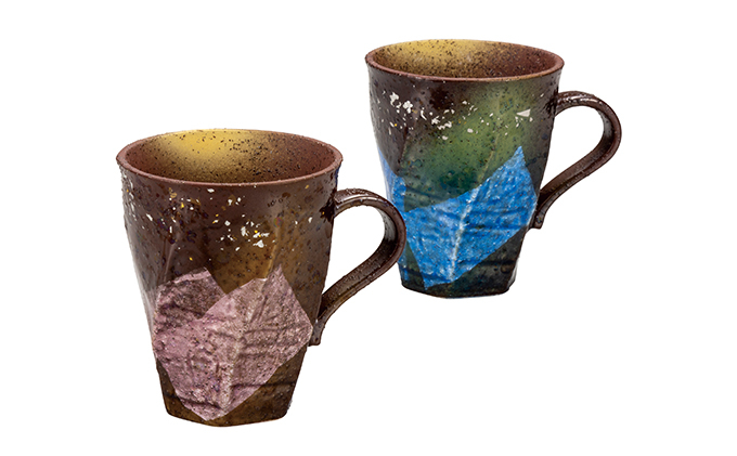 人気の銀彩画法に金とプラチナの散しをあしらったペアマグカップです。カタチも人気があります。