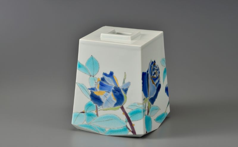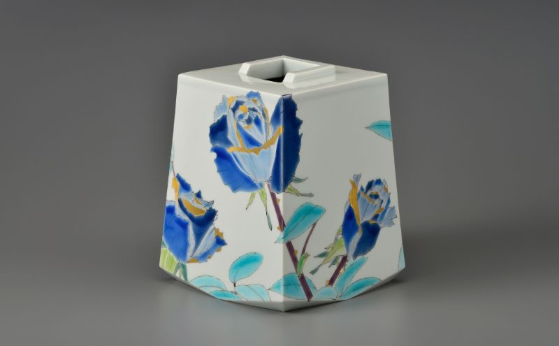 庭に植わっているバラを写生して、モチーフにした作品です。白磁に青の濃淡でバラが描かれ、凛とした美しさが表現されています。造形から手掛けられ、立体感ある作品となっています。