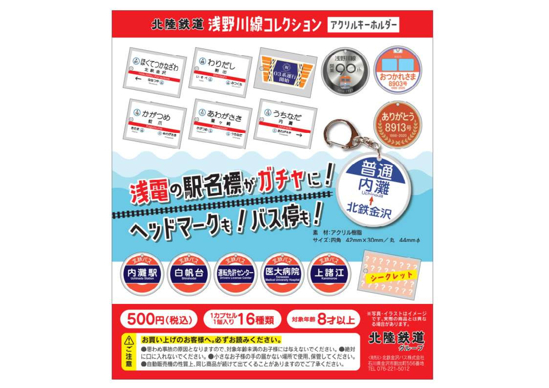 内灘駅に設置されているカプセルトイ「北陸鉄道鉄道線キーホルダー浅野川線コレクション」のシークレット含む全16種のコンプリートセットをお届けします。駅名標やバス停に加え、当時実際に使用していたヘッドマークのデザインを模したキーホルダーです。この中から皆さまのお気に入りを見つけてください!