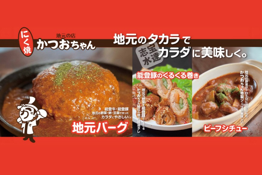 中でも地元グルメの「地元バーグ」「ビーフシチュー」「能登豚のくるくる巻き」の3品は、