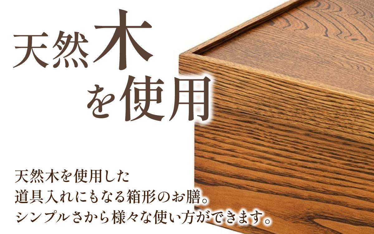 天然木を使用した道具入れにもなる箱形のお膳です。食器類や茶道具を収納できるほか、上蓋をひっくり返すと盆に早変わり。伝統的な箱膳ですが、そのシンプルさから様々な使い方ができます。