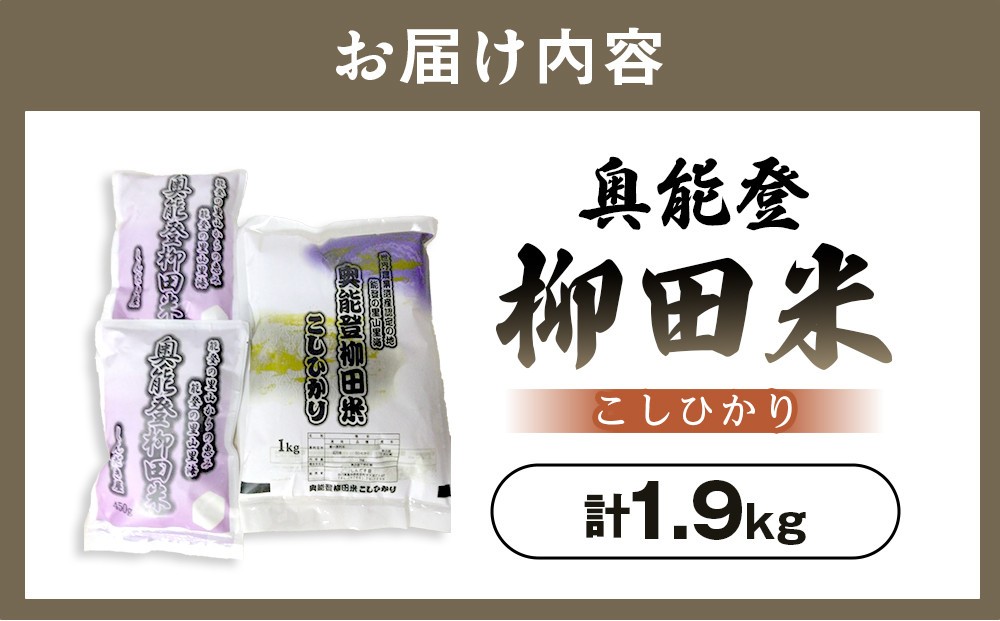 | 容量 | 奥能登柳田米こしひかり 1Kg×1袋=1Kg 450g×2袋=900g 合計1.9Kg |