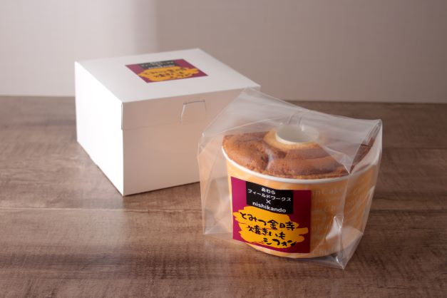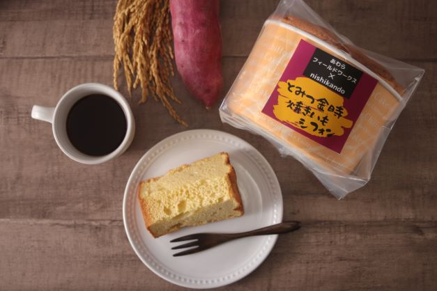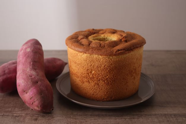 福井の美しい土地や豊かな土壌で、育まれたさつまいもやお米、卵をふんだんに使ったシフォンケーキは、独特の柔らかさを誇り、型から外し、カットするとお辞儀する程に柔らかく儚い程です。