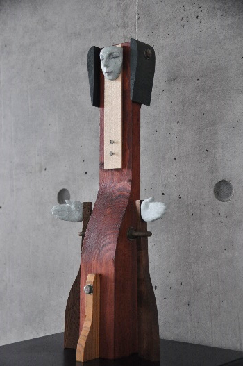 笏谷石・木片・鉄金具、違素材の不協和音と一つの生命を模した像の調和(カノン)。その旋律の模索。