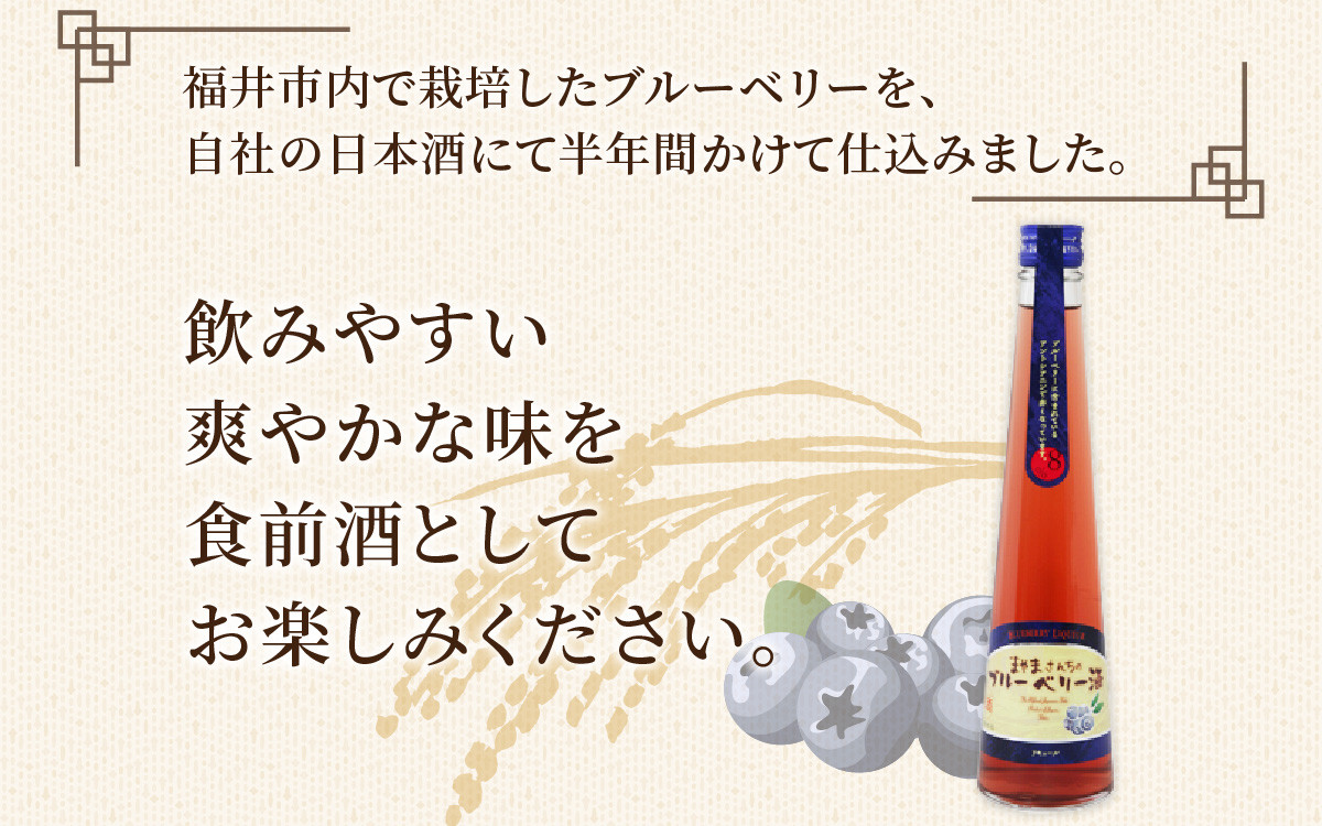 福井市内で栽培したブルーベリーを自社の日本酒にて半年かけて仕込みました。
