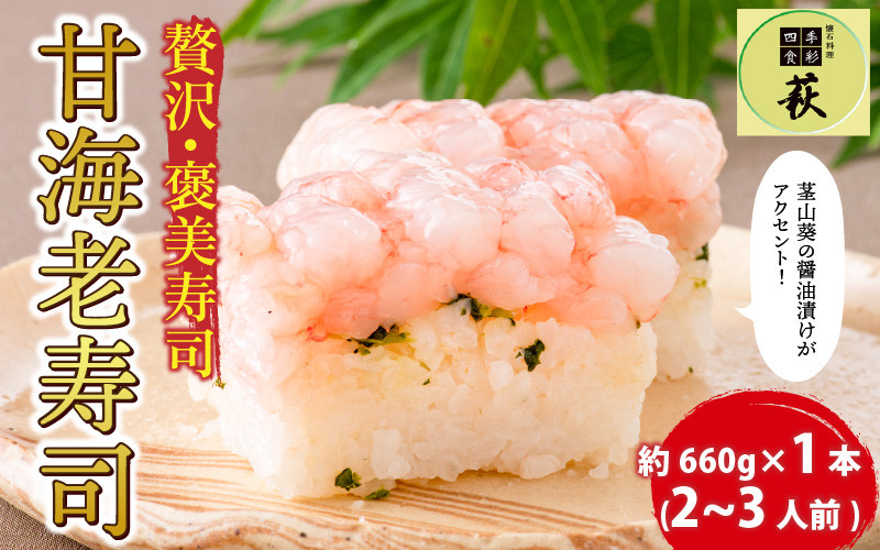 | 容量 | 甘海老寿司 1本 【商品サイズ】 通常サイズ(2~3人様用) 約210 × 75 × 30mm / 660グラム |