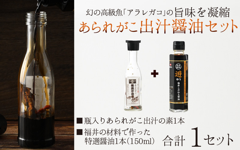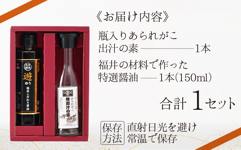 | 容量 | ■瓶入りあられがこ出汁の素1本 ■福井の材料で作った特選醤油1本(150ml) |