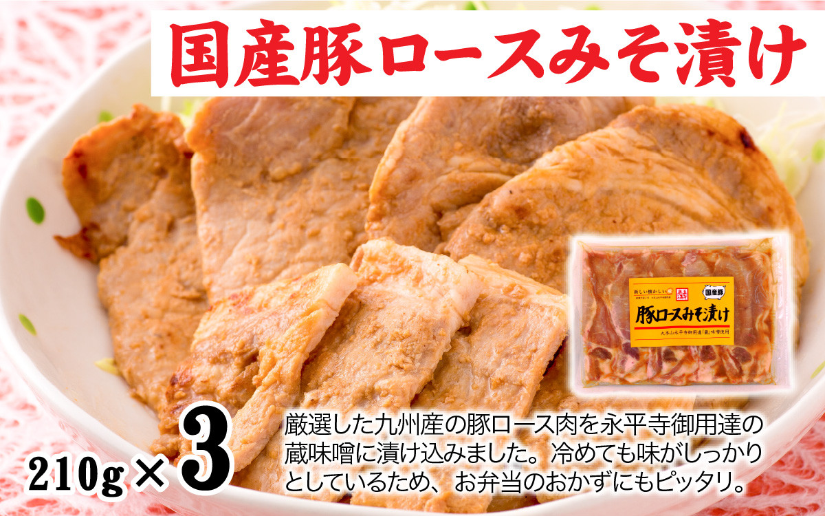| 容量 | (国産)豚ロースみそ漬け(210g)×3パック 越前鶏みそ漬け(250g)×3パック |