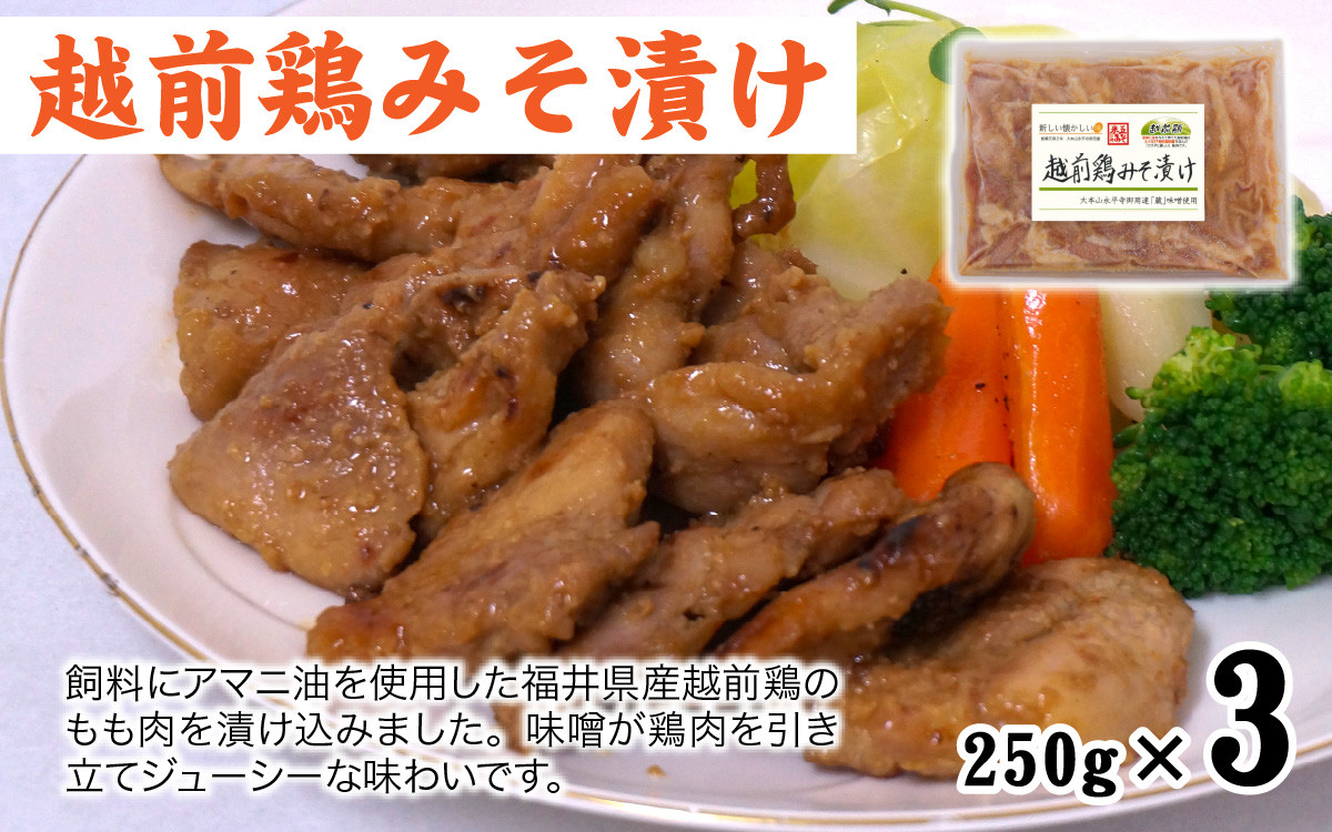 【越前鶏みそ漬け】飼料にアマニ油(人間の体に必要な成分を含んだ健康油)を使用した福井県産越前鶏のもも肉を大本山永平寺御用達の味噌「蔵」で漬け込みました。味噌が鶏肉を引き立てジューシーな味わいです。
