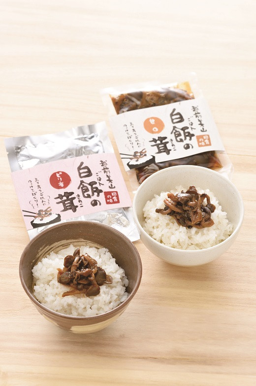白飯の茸は、甘口とピリ辛のつくだにです。