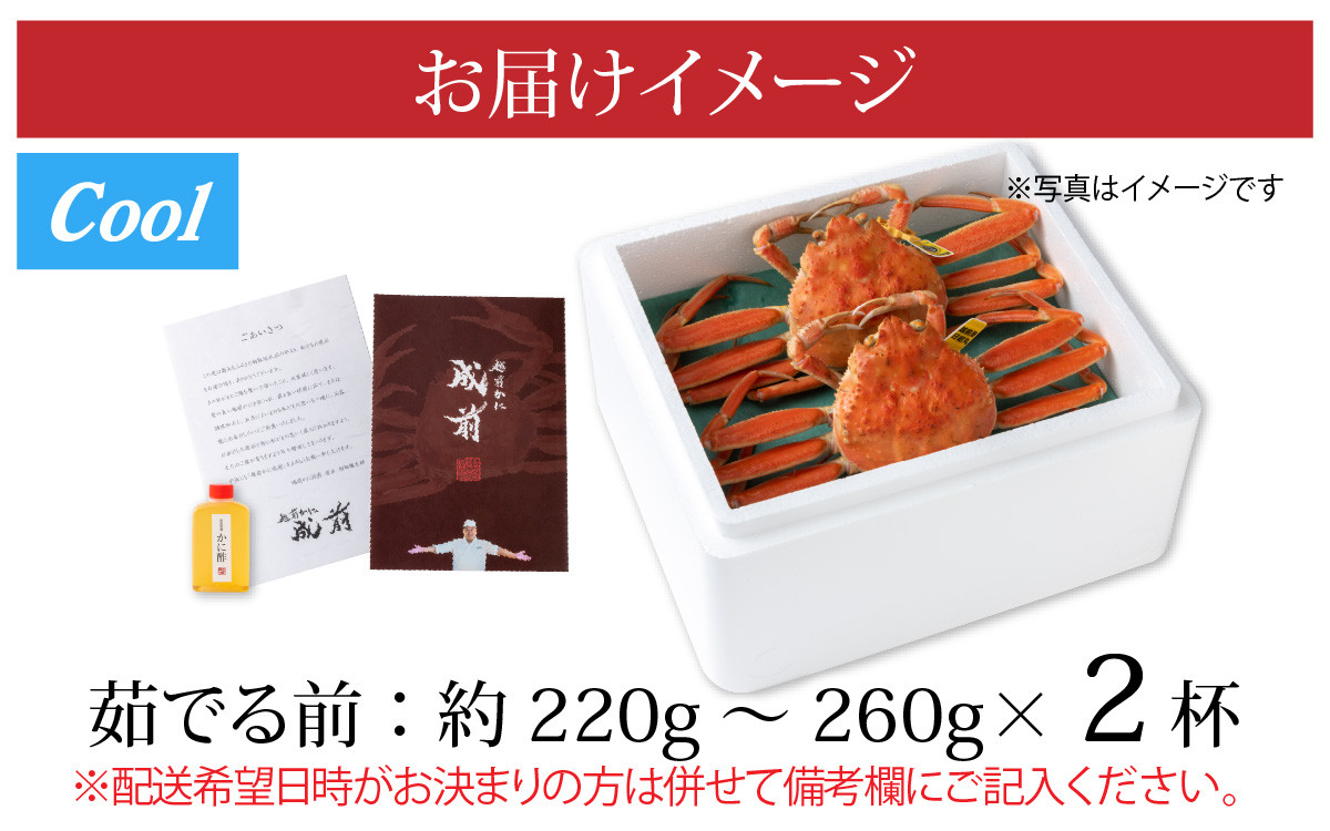 「姿」「甲羅盛」2種の調理方法、発送月もお選びいただけます。 【先行予約】選べる!美味しさ直送【成前特選】 せいこがに(220g~260g)×2杯【11月~1月発送】 [E-028045] / ズワイガニ 甲羅盛り 越前がに かに 蟹 楚蟹 セイコ蟹 越前かに 香箱がに こうばこがに 親ガニ こっぺがに せこがに 甲羅蟹 甲羅がに 香箱蟹 メス ずわいがに カニ セイコガニ 姿