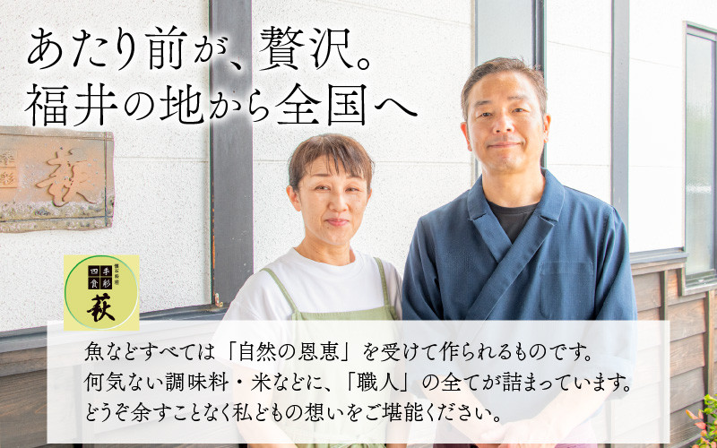 シャリは福井県産米、酢は小浜の江戸時代より続く老舗のお酢、塩は越前海岸の海水から作る天然塩とまさに福井県産づくしのふるさと納税にふさわしい商品です。
