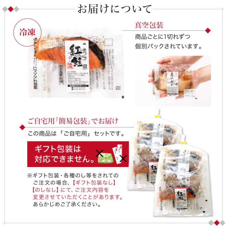 | 容量 | 紅鮭 塩焼:約50g×2切 赤がれい 煮付:約50g×2切 ぶり 煮付:約50g×2切 さば味噌 煮付:約50g×2切 ※漁の関係上、魚種が変更になる場合があります。 |