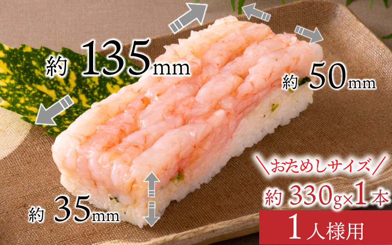 | 容量 | 【おためしサイズ】甘えび寿司 小サイズ(1人様用) 約135mm×50mm×35mm/約330g×1本 |
