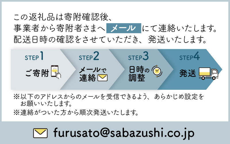 決済から30日前後で発送 ※注文後発送の準備が整い次第、事業者から寄付者様へ連絡をいたします。 ※連絡がついた方から順次発送いたします。 お申し込み時には、事業者のパソコンからメールを送付し、配送日時のご調整を行いますので、受け取りができるよう、ご設定をお願いいたします。 【メールアドレス】furusato@sabazushi.co.jp ※ 外箱のギフト包装・のし対応をご希望の方は、事業者から電話の際に合わせてお申し付けください。 ※ 消費期限の関係で、沖縄と離島を配達不可地域としておりますので、予めご了承ください。 |