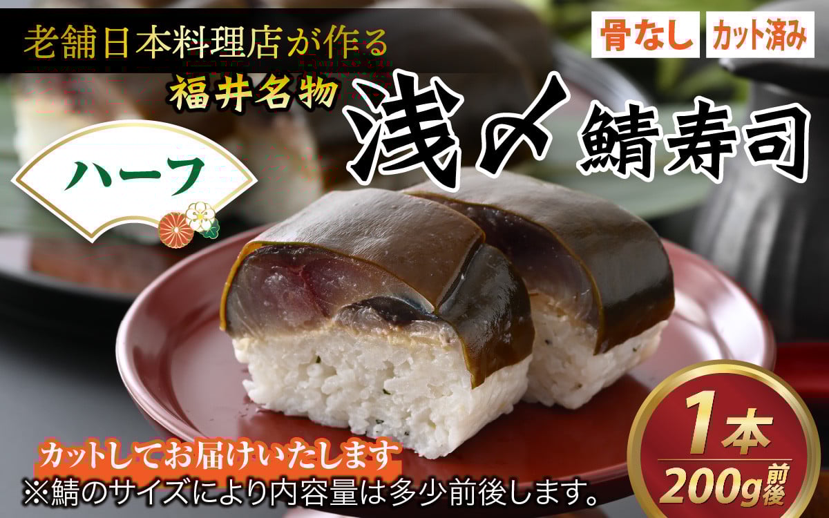 浅〆鯖寿司を旨味を閉じ込めてお届け! 老舗日本料理店が作る「越前福井名物 浅〆鯖寿司」 ハーフサイズ 1本 【 鯖寿司 浅〆 〆鯖 肉厚 福井県産米 国産 】[A-085011]