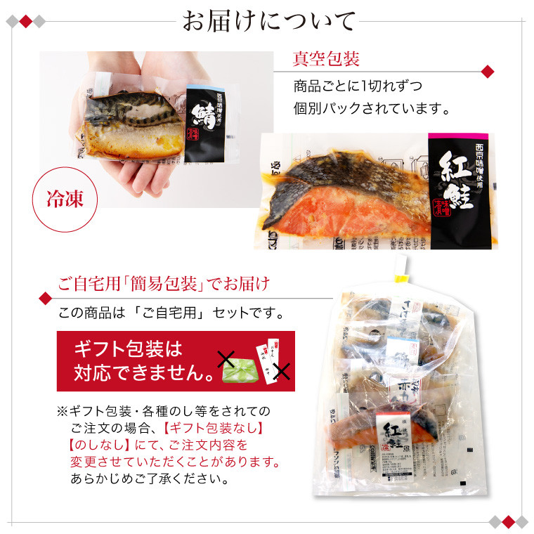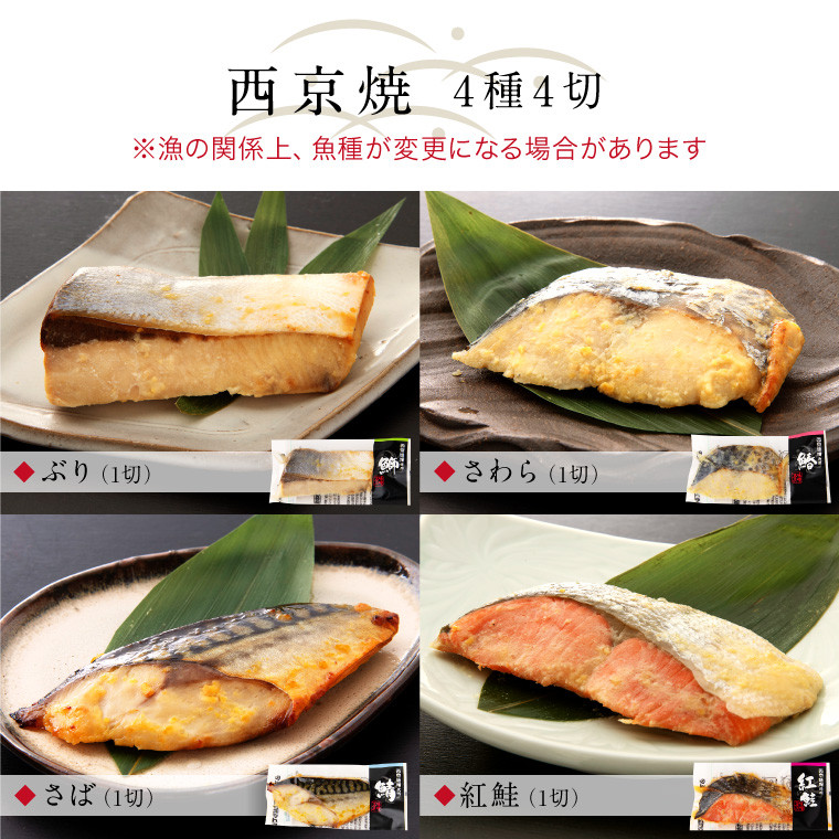 | 容量 | 西京焼 4種4切セット [冷凍] ぶり1切 さわら1切 さば1切 紅鮭1切 ※漁の関係上、魚種が変更になる場合があります |