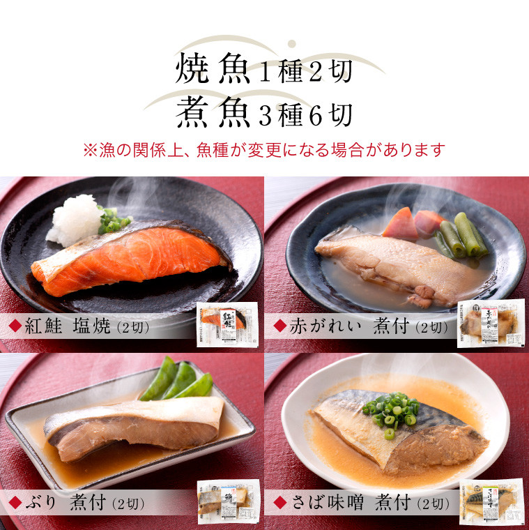 | 容量 | 煮魚・焼き魚・西京漬け 8種16切 [冷凍] 紅鮭 塩焼…2切 赤がれい 煮付…2切 ぶり 煮付…2切 さば味噌 煮付…2切 ぶり 西京漬け…2切 さわら 西京漬け…2切 さば 西京漬け…2切 紅鮭 西京漬け…2切 ※漁の関係上、魚種が変更になる場合があります |