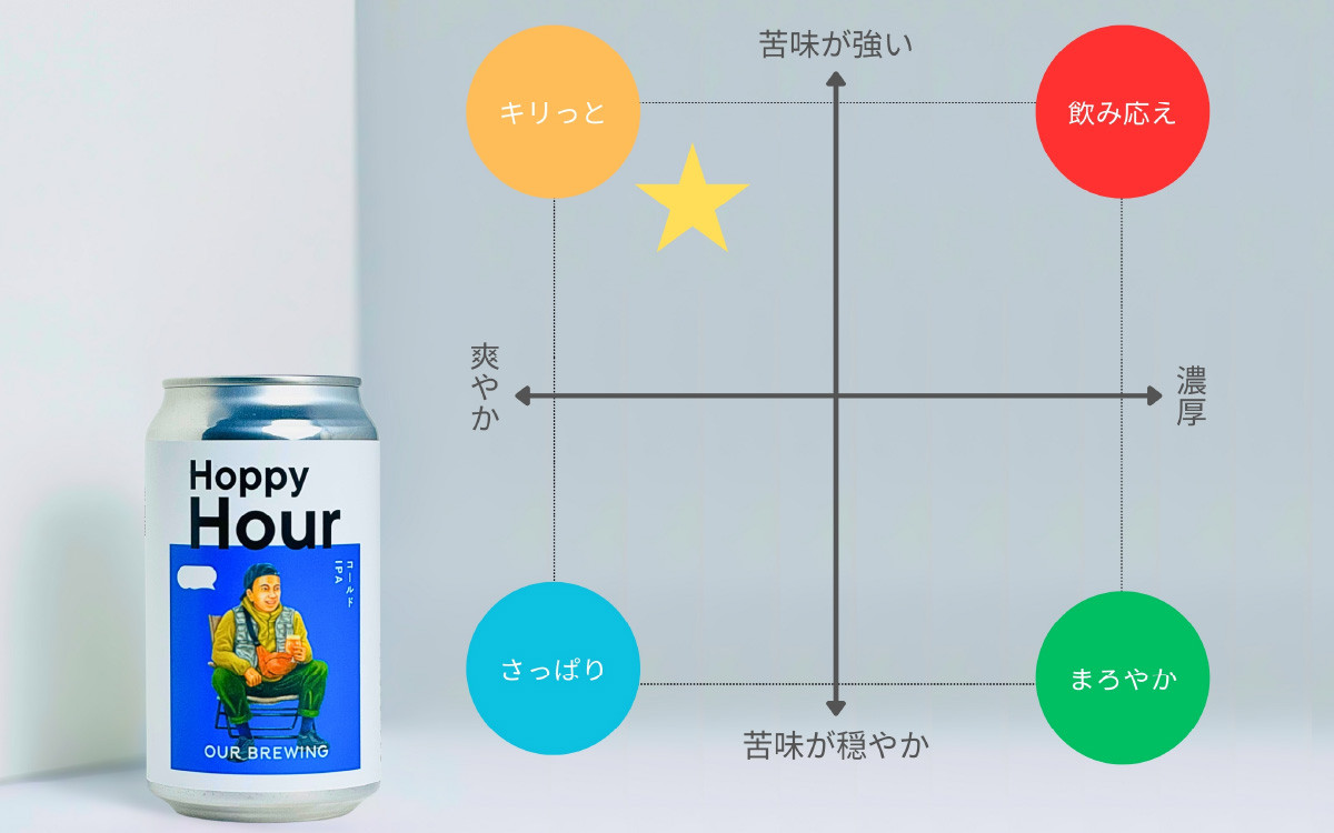 Hoppy Hourのテーマは「温故知新」。日本で広く親しまれているラガーの製法をベースに、現代的な手法である「ドライホッピング」(発酵中にホップを加えることでホップの個性を強く出す製法)を施したビールです。ラガーの清涼感とコクに加え、ホップの香りと個性を存分に楽しむことができます。焼き鳥や唐揚げ、餃子など、今までラガービールが求められていたシーンに、新たな選択肢として選ばれるビールを目指しました。